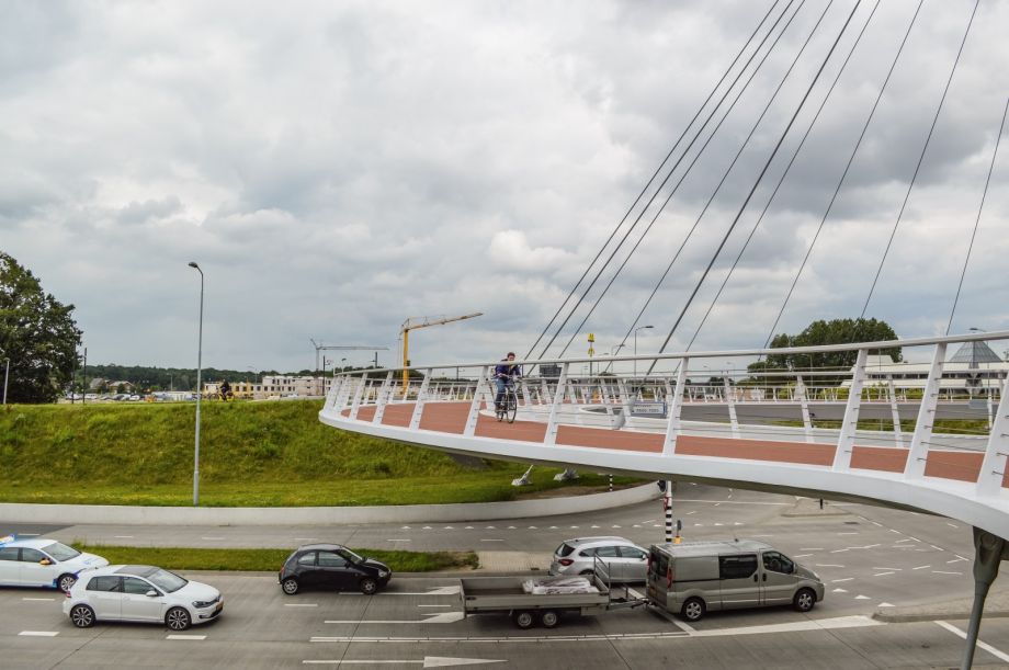 After considering numerous design options, including a series of Berenkuil-like sunken tunnels, the Dutch engineering firm ipv Delft presented the stunning circular suspension bridge concept, which took vertical separation to the next level. “It was more expensive,” recalls Braakman, “but we saw it as an icon for Eindhoven.” Fortunately, the politicians and decision makers involved saw tremendous value in investing in a symbol that sent a strong visual message home and abroad: “‘This is how Eindhoven, like all the other Dutch cities, is paying attention to cycling,’” as Veraart puts it. “That’s much easier than showing a map with the grid of cycle tracks, for example. That doesn’t convey the message of ‘We’re working on it.”’