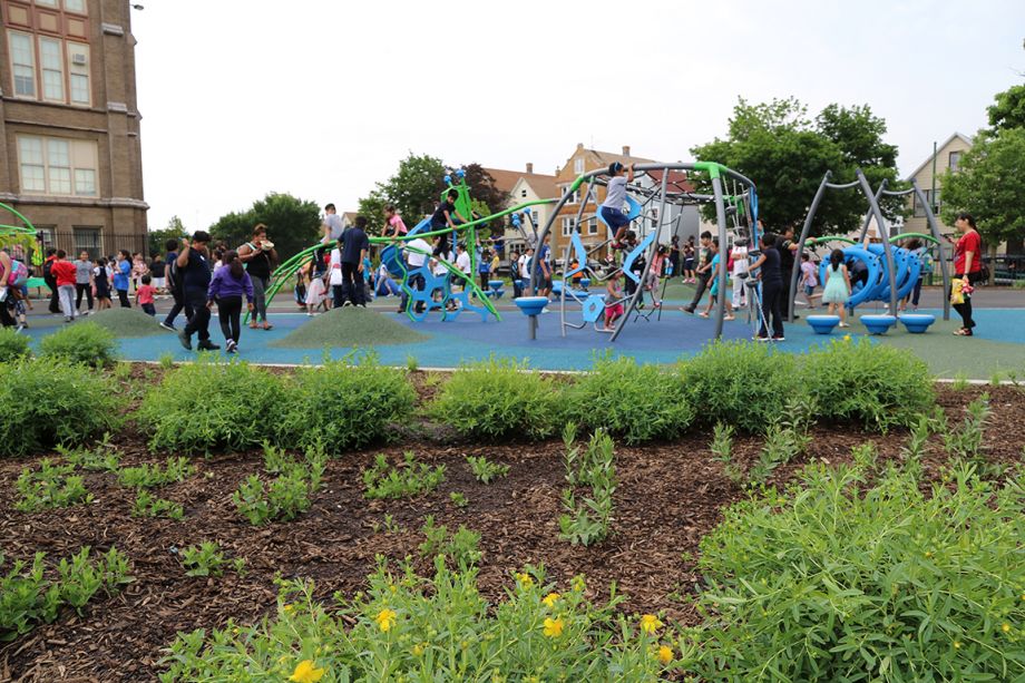 At the same time, the city’s water agencies — Metropolitan Water Reclamation District of Greater Chicago (MWRD) and the Chicago Department of Water Management (DWM) — were initiating major investments in green stormwater infrastructure to combat Chicago’s persistent flooding issues and build climate resilience. Space to Grow’s nonprofit managing partners, Healthy Schools Campaign and Openlands, came together with these public water agencies and the school district to develop a vision for green schoolyards across Chicago that would not only manage significant amounts of stormwater, but also provide outdoor learning, play, gardening and community recreation opportunities. The three public agency partners made an initial investment of $51 million to transform 34 schoolyards.